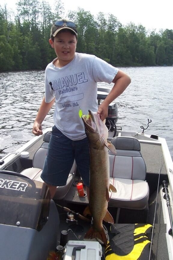Check out the 40-inch prize muskie caught right out in front of our dock this morning (July 6, 2008). And we, Mike, Willow, a resort guest by the name of Sue and I, witnessed the entire catch.